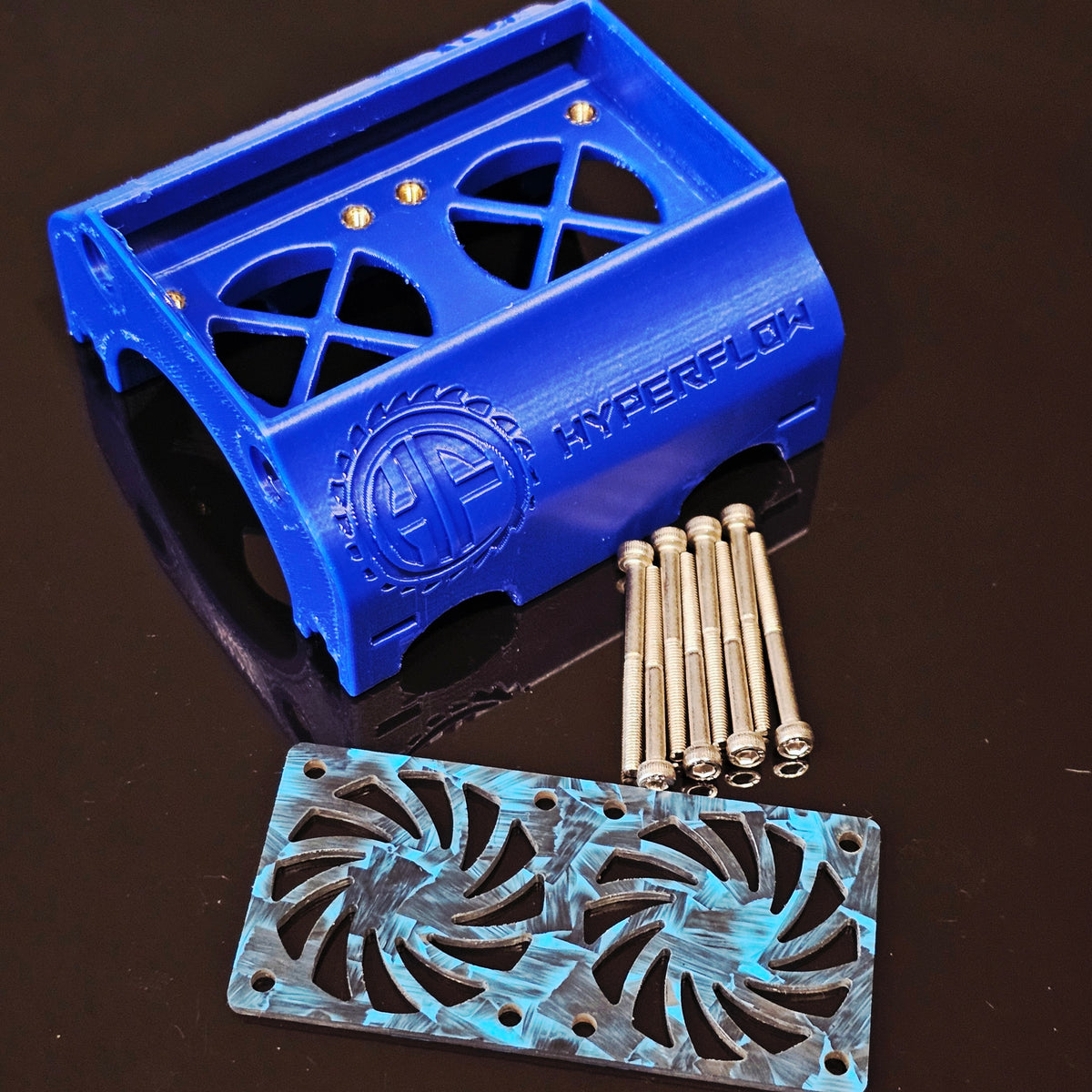 HyperFlow Fans Twin 40mm fan shroud for the Traxxas X-Maxx. This allows you to run dual 40mm fans above your motor. This shroud attaches to the upper chassis rail allowing you to cool any size motor.